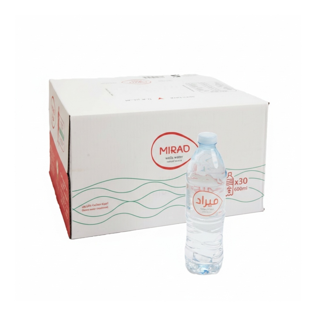 كرتون موية ميراد 600 مل (30 عبوة)، الحجم المشبع الذي يروي ظمأك تماماً، ورفيقك الأمثل في النزهات والرحلات.